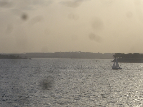 A small sailboat glides through the water in hazy light, pictured through a lens that is occluded by drops of sea water or grains of sand.