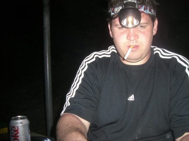 A man staring at an object with a flashlight strapped to his head and a cigarette hanging from his mouth.