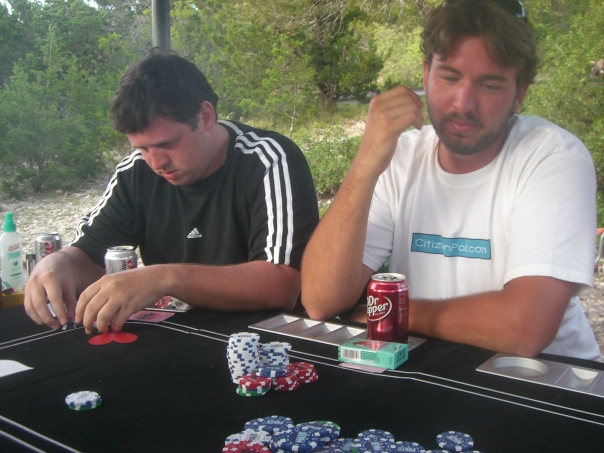 two man sitting at an open-air gambling table, one playing with his chips the other looking at the pot
