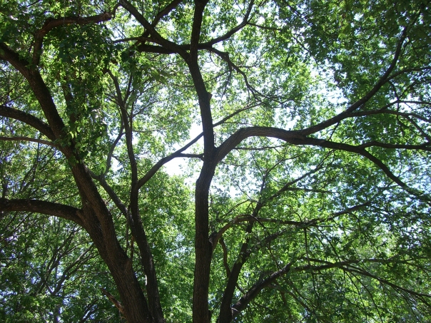 View of the top of a tree shows various sized limbs and leaves sky in background