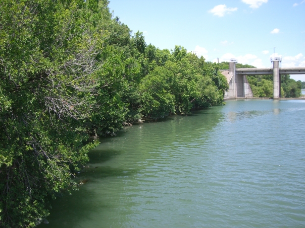 Blue sky, blue water, green foilage, a perfect summer day, on the river.