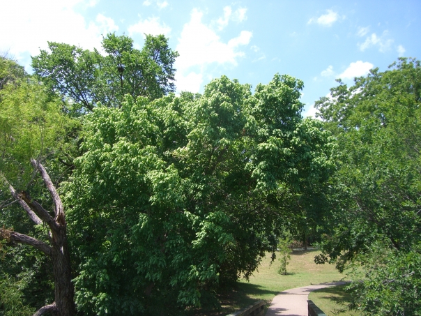 Leafy green trees frame a cement walkway through a park, on a bright sunny day.