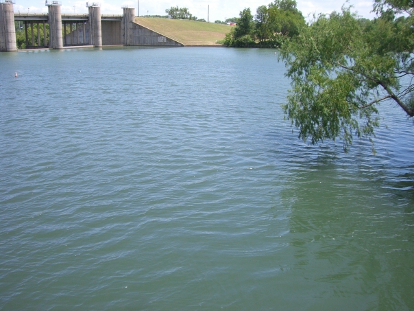 A tree branch over hanging a large lake or body of water with a dam in the background.