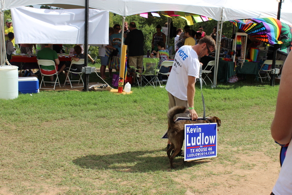 There is a man that is touching a Kevin Ludlow campaign sign he is holding the leash to his dog