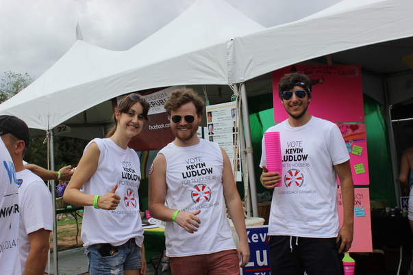 Three people with shirts that say "Vote Kevin Ludlow" are standing near a white tent.