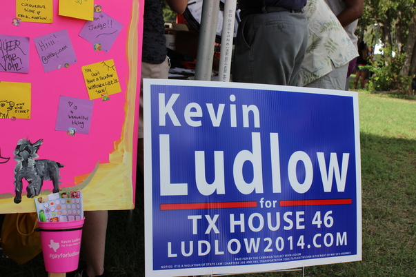This is a sign that says "Kevin Ludlow for TX House 46 ludlow2014.com" next to a hot pink board with post-it notes on it.