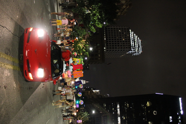 Red car followed by people on a city street at night.