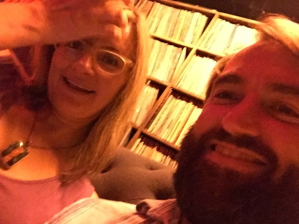 A bearded man with dark hair and a woman with shoulder-length blonde hair and glasses smile as they look at something together.