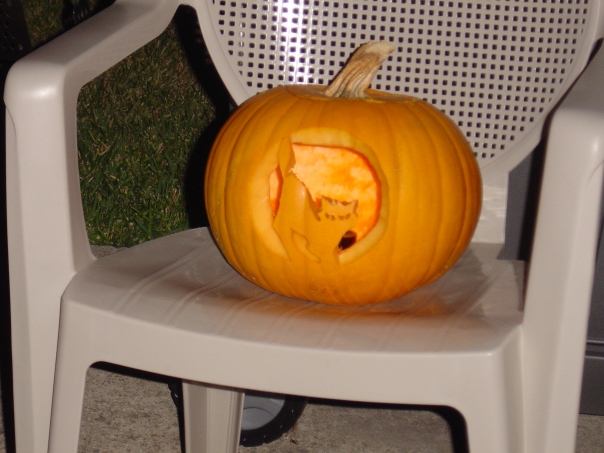 A pumpkin with a cat carved into it, sitting on a plastic chair.