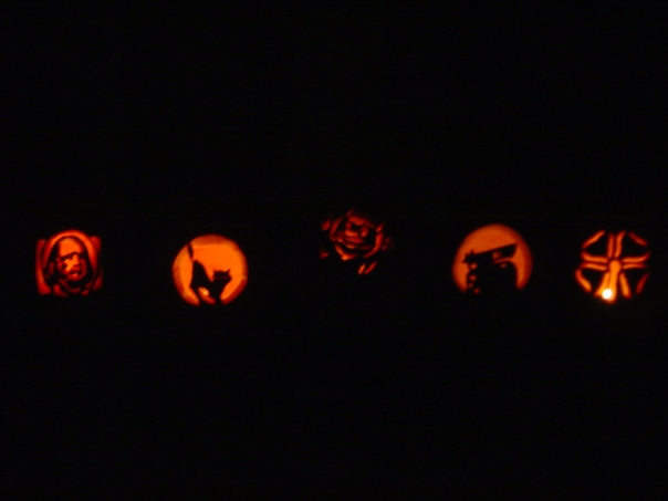 A Ben Franklin jack-o-lantern next to a cat jack-o-lantern next to three indistinguishable jack-o-lanterns.
