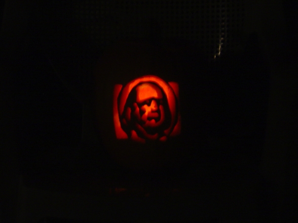 The ghost of george washingtons first pumpkin complete with a teardrop tattoo.