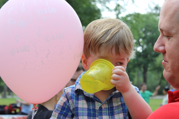 A boy holds a cup covering his eye and mouth next to a pink balloon