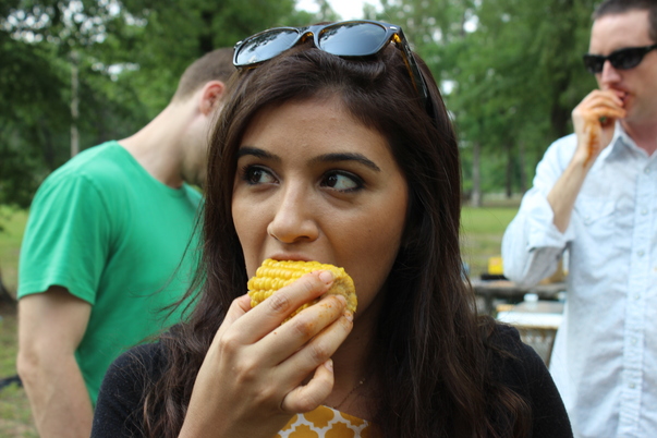 A girl with long dark hair and sunglasses perched up on her head is heading corn on the cob with her hands while two men stand behind her.