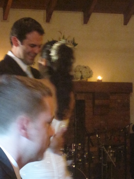 A bride and groom dance at their wedding in this blurry picture with a man's face in the foreground.
