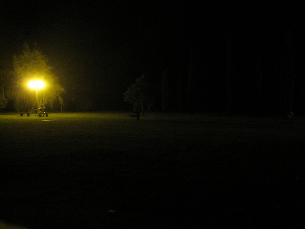 A night time shot in a park with a dimly light lamp post.