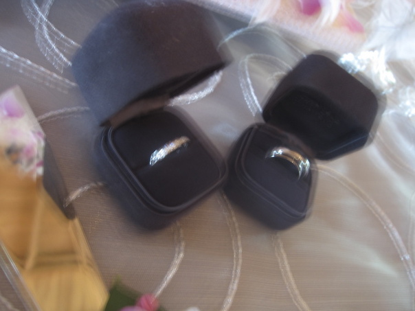 This blurry photograph features a close-up of a set of silver engagement or wedding bands nestled inside their individual black jewel boxes.