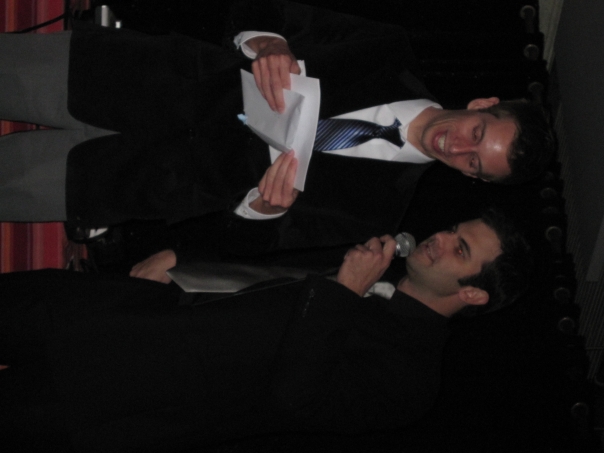 Two formally dressed young men stand in front of a DJ booth draped in red, striped fabric and are looking at a piece of paper that one is holding while the other holds a silver microphone.