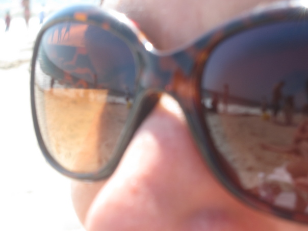 A man stranded in beach he ware sunglasses and some people is ready to swim in sea.