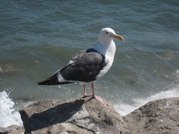 A seagull with white and dark grey feathers is perched atop a rock.