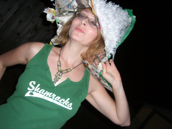 A girl in a green Irish shirt wearing a paper mache fuzzy hat.