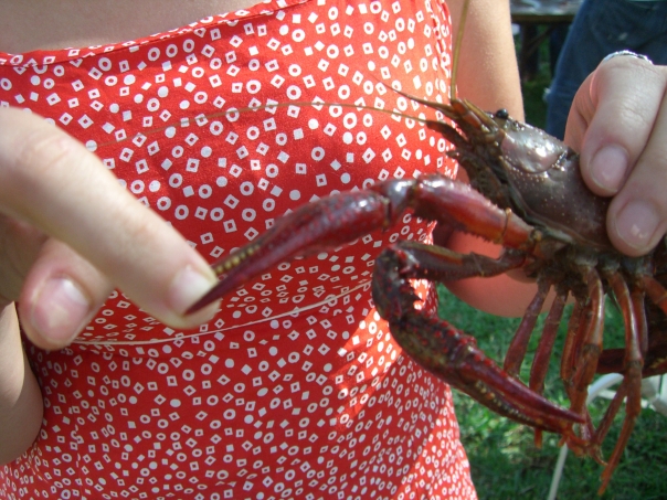 a woman in a red dress grabbing a crab or some sort of crawfish which pinches her finger