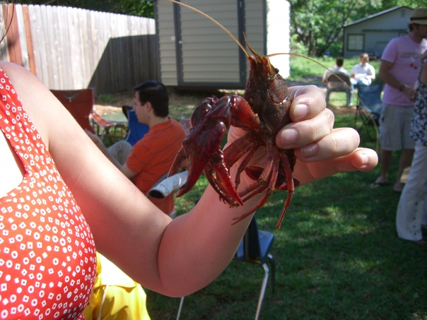 A woman at a backyard picnic is holding a dark red crawfish with a cigarette butt in it's claw.