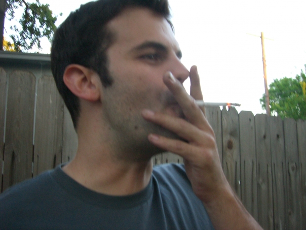 outdoors,a young man with short black hair and a light blue t-shirt inhales smoke.