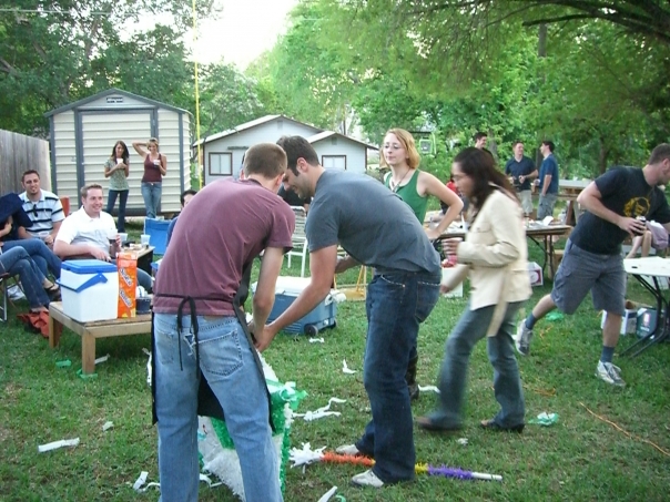 A friendly group gathering of people, and they are enjoying a pinada and drinks.
