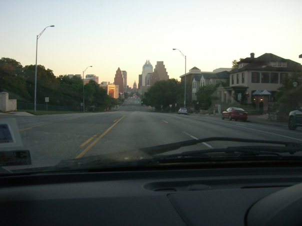 Through the windshield of a car, view of a street and some tall buildings in the distance around sunset. Trees and some houses off to the sides.