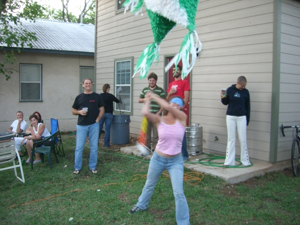 A blindfolded woman at a backyard party, with a keg present, is aggressively swinging at a green and white pinata.
