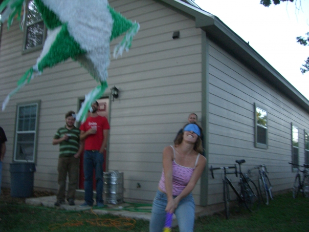 This is a great pic of a women blindfolded with a blue blind fold trying to hit a pinata and three guys laughing near by with what looks to be glasses of beer.