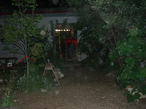 A dirt path partially obscured by leaves and branches leads to a doorway of a white building with people inside.