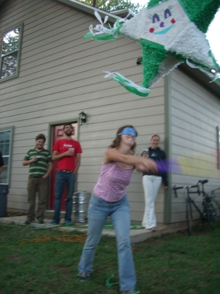 Three onlookers watch a blindfolded girl swing at a green and white pinata. There is a beer keg and bicycle in view.