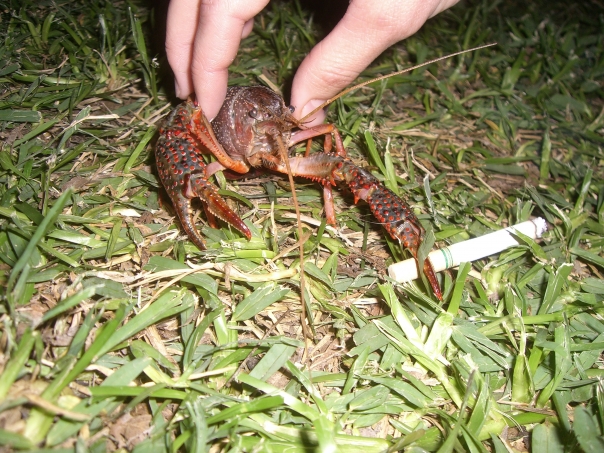 The human hand is holding a crawfish with a white cigarette in the claw.