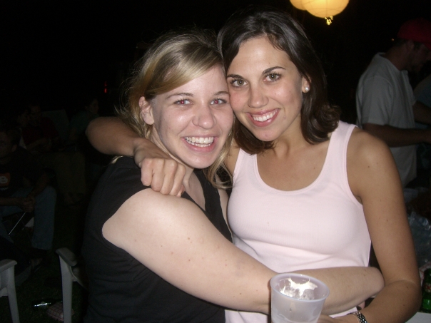 Two women hug each other and smile at what appears to be an outdoor evening party.