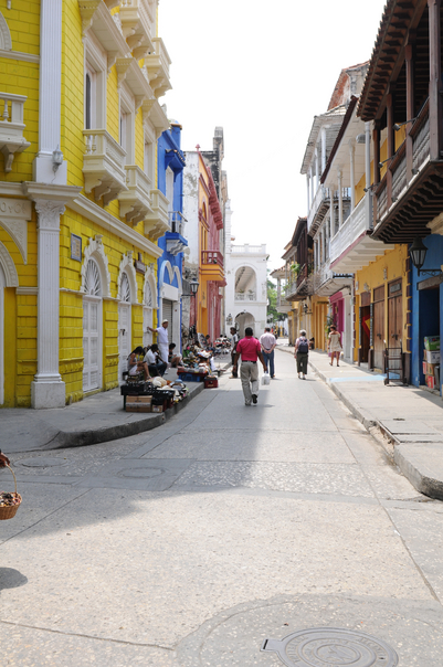 here some people are walking on the road and some sitting on the bench in front of the two buildings |