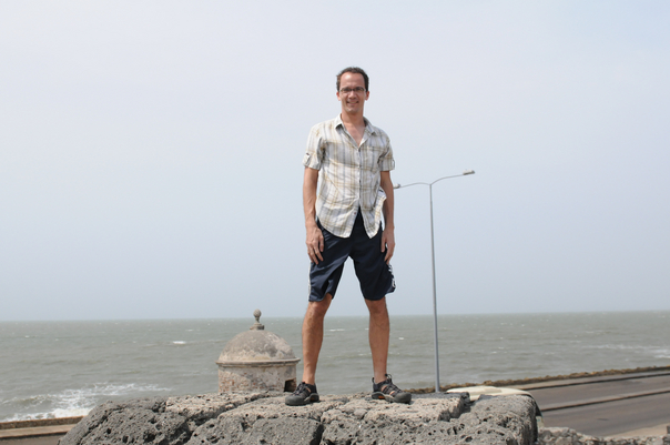 here we can see the man standing on the stone near the beach |