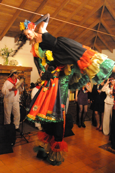 The woman with the colorful dress is dancing at the festivities. |