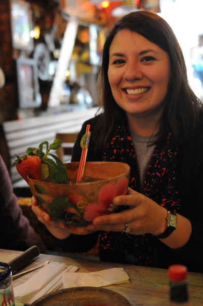In a restaurant, a smiling woman sitting at a table next to another customer holds up a flower-decorated bowl containing a strawberry garnish on one side, food or drink, and a straw.