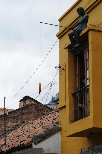 its look like a man sitting on the window and holding something from the above |
