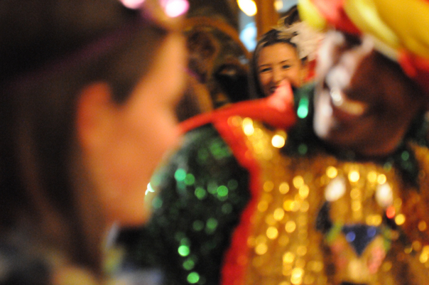 A costume party where a black man is wearing a jokers costume and talking to a lady. |