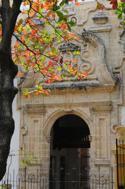 This is a picture of a branch with green and orange leaves in front of a doorway in a stone entrance with a small iron fence in front. |