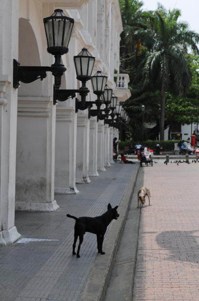 here we can see the picture of building ans some dogs and birds roaming around that building |