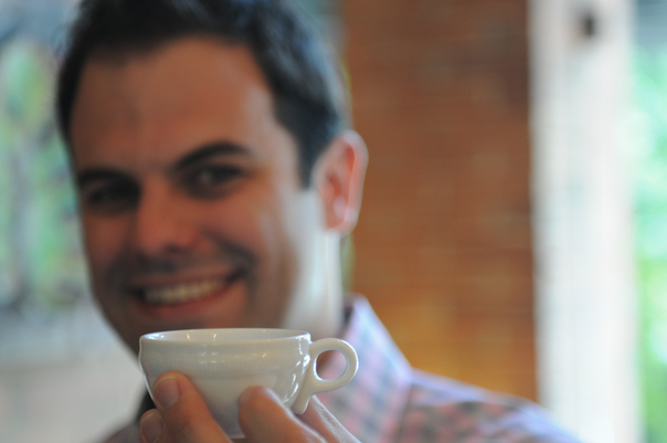 Dark haired man smiling and holding up a small, white teacup. |