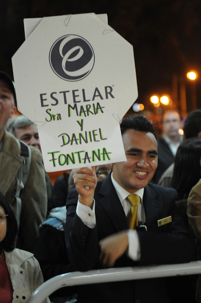 Man holding a sign and waiting for a woman and a man |