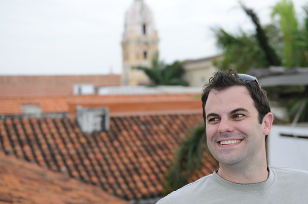 The man stands on his porch that over looks his neighbors' roofs. |
