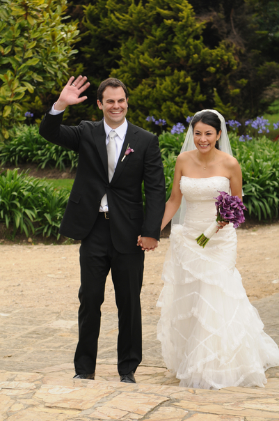 The newly wed couple is happily waving to their guest. |
