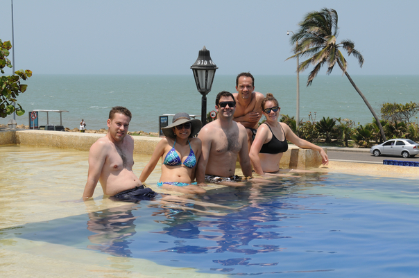 Four people sit in a pool near the ocean with a man standing behind them outside the pool. |