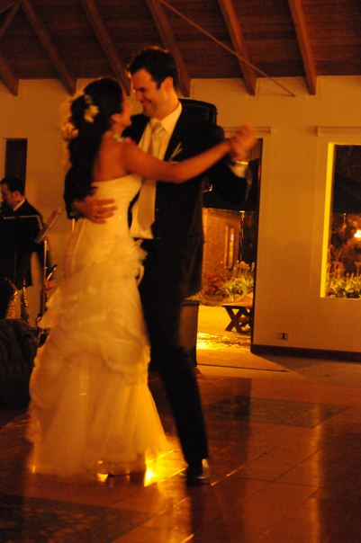A man in a dark suit and a woman in a long,white wedding dress dance upon a shiny dark floor. |