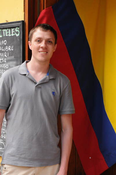 The man is wearing a grey polo shirt and khaki pants while posing for the photo. |
